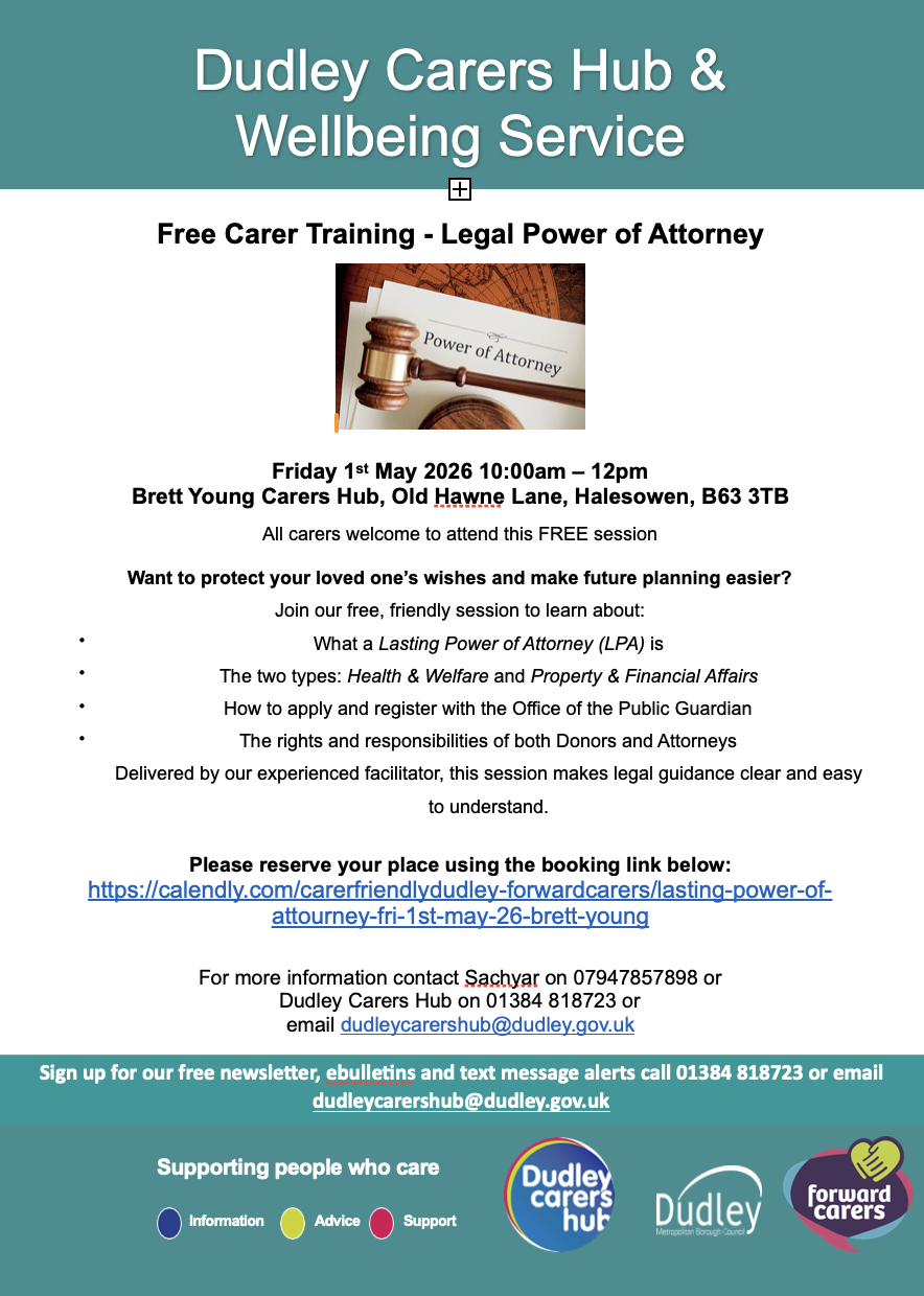 For more information contact Sachyar on 07947857898 or Dudley Carers Hub on 01384 818723 or email dudleycarershub@dudley.gov.uk.